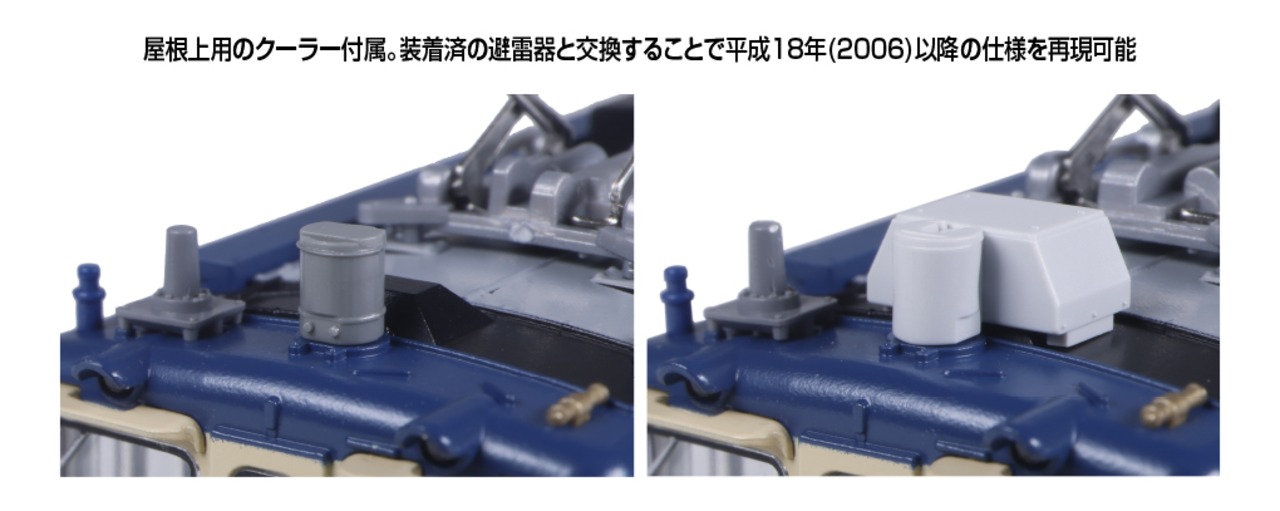 ④屋根上用のクーラー付属。装着済の避雷器と交換することで平成18年(2006)以降の仕様を再現可能