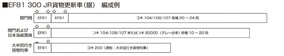 現在も九州内の貨物輸送に従事するEF81 300番台をJR貨物仕様で製品化いたします。EF81 300番台は、関門トンネル通過対策でステンレス製の車体構造で昭和48年(1973)から翌々年にかけて301~304の4両を製造、全て門司機関区に配置されましたが、昭和53年(1978)に301・302号機の2両が常磐線に転属しました。その後、昭和61年(1986)に再び門司に集結、貨物列車牽引のための重連改造が施されました。民営化後はJR貨物に承継、平成10年(1998)以降には更新工事が行われ、平成22年(2010)より関門での運用を後任のEH500に譲り、九州内の運用に変更されました。4機とも富山機関区に一時期貸し出され、その際に銀色の303・304号機でスノープロウ付の形態も見られ注目を集めました。現在は303号機が九州で最後の活躍を続けています。