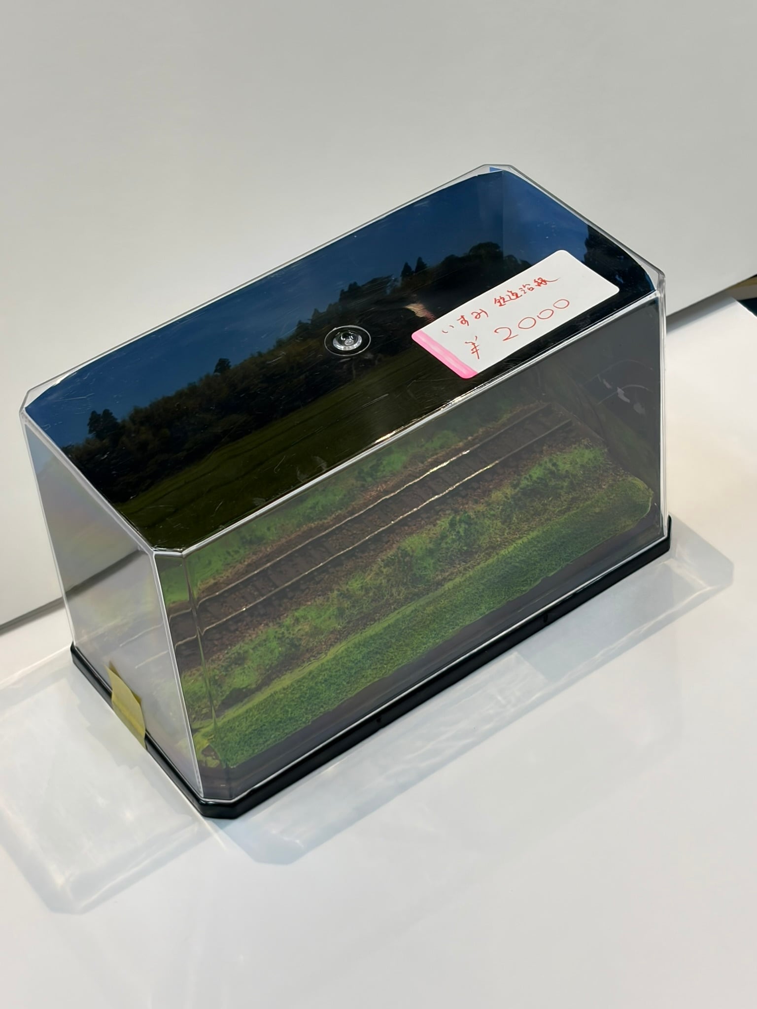 この飾り台は、千葉のローカル線の風景を使用した背景があり、実際の風景に基づいたリアルな表現が楽しめます。また、プラスチックケースを採用しており、大切な模型をほこりから保護し、飾られた車両にリアリティをプラスします。